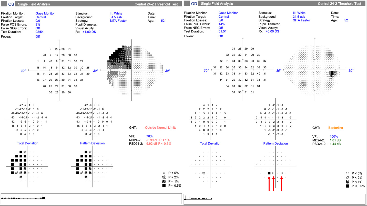 Visual field testing produced unremarkable results in the right eye, other than 3 points of pattern reversal likely attributable to the 14% false-positive rate (Figure 4). A dense superior temporal defect connected to the blind spot appeared in the left eye, which extended into the inferior temporal quadrant but respected the vertical midline (Figure 4). Though not available for review, the written assessment of the prior visual field examination also documented a left eye “temporal defect, more dense superiorly.”