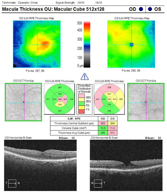 A 61-year-old man presented to the binocular vision clinic with symptoms of macropsia in the right eye after receiving a membrane peel 1 year prior to examination and cataract surgery 2 months prior to examination. He had been diagnosed with a lamellar hole in the left eye, contributing to left eye micropsia (Figure 1). No ocular surgeries had been performed. He subjectively estimated that the image was approximately 10% more vertically magnified in the right eye and reported constant vertical binocular diplopia as well as worsened depth perception. This significantly impacted his enjoyment of activities such as hiking, biking, fly fishing, and skiing. His medical history was noncontributory.