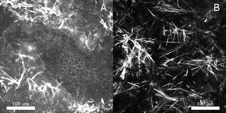 We are aware of one similar case report of bilateral arcuate paracentral refractile deposits in a patient wearing scleral contact lenses many years after post-LASIK keratectasia.3 This case was similar to ours in that the refractile deposits were arcuate and paracentral and optical coherence tomography confirmed the changes were deep to the LASIK flap interface. In both cases, the scleral contact lens demonstrated complete corneal clearance; however, our case differed in that it was post–cross-linking and unilateral (with the other eye exhibiting no such signs). The authors hypothesize that although the scleral contact lens fit was good, hydrostatic pressure exerted by the scleral contact lens during wear and removal on the tear film, combined with a compromised ectatic cornea, might have led to the tears film’s salt crystals precipitating in the stroma as a biomechanical effect. Our patient would remove the scleral lens without the recommended loosening of the seal first, thereby increasing hydrostatic pressure on the cornea. The hyperreflective needle-like opacities on vivo confocal microscopy findings in our case have previously been reported.6