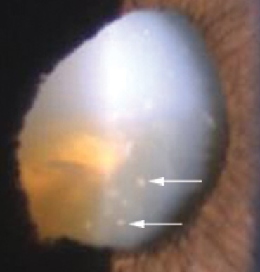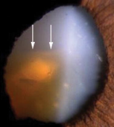 Clinical findings of elevated intraocular pressure with open angles on gonioscopy, in the presence of a hypermature cataract, should prompt careful evaluation of the patient’s anterior chamber.1 Anterior chamber evaluation will reveal flare and macrophages, which are larger and have a more translucent appearance than white blood cells seen in uveitis.1,19 White flocculent material, presumed to be liquified lens cortex, and refractile particles, identified as cholesterol crystals, may also be seen in the anterior chamber.7,20,21 These cholesterol crystals are thought to originate from degraded lenticular cell membrane.22 Collection of lens protein material and crystals layered in the inferior anterior chamber may form a pseudohypopyon.23,24 Patients can also present with corneal edema as a result of markedly elevated intraocular pressure.7