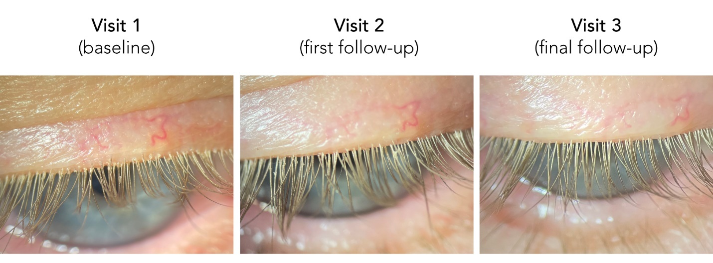 The patient was diagnosed with Demodex-associated blepharitis. Treatment with 0.25% ophthalmic lotilaner was deferred due to insurance-mandated step-therapy requirements. The patient declined an at-home regimen of 0.5% ivermectin lotion and instead proceeded with in-office administration of the medication, which was performed without incident (Figure 2).