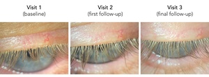 Each patient in this case series underwent 2 in-office applications of 0.5% ivermectin lotion performed 2 weeks apart for symptomatic Demodex-associated blepharitis. Slit-lamp biomicroscopy was performed and the eyelids were photographed before each ivermectin application and at final follow-up. Treatment was delivered using a modified Helm protocol.19 Initially, a drop of 0.5% proparacaine hydrochloride was instilled into each eye. The exam chair was reclined, and 0.5% ivermectin lotion was applied to the base of the upper and lower lashes with a cotton-tipped applicator, taking care to keep the lotion off the ocular surface. After saturating the upper and lower eyelashes, the lotion was applied to the surrounding eyelid skin and eyebrows. It was left in place for 10 minutes and then removed with a sterile-saline soaked eye pad. A small amount of residual lotion was purposefully left at the base of the lashes. Finally, as a precaution, the ocular surface was rinsed with 0.4 mL of preservative-free artificial tears before the patient was discharged.