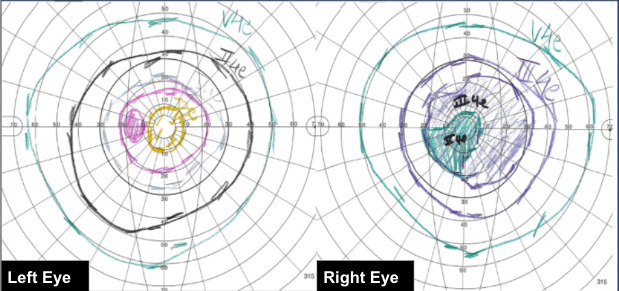Figure 2 shows Goldmann visual field testing which demonstrated a central defect in the right eye extending 20 degrees superiorly, inferiorly, and nasally, and 30 degrees temporally with the III4e isopter. The left eye exhibited a full visual field.