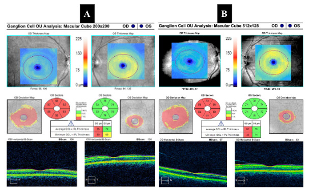 Figure 3 shows optical coherence tomography of the optic nerve which revealed small optic discs bilaterally. The right eye showed nasal retinal nerve fiber layer elevation while the left eye demonstrated inferior retinal nerve fiber layer elevation. Vitreopapillary traction was present in both eyes. Figure 4 shows optical coherence tomography of the macula and ganglion cell complex which showed diffuse thinning 360 degrees in the right eye while the left eye was within normal limits.